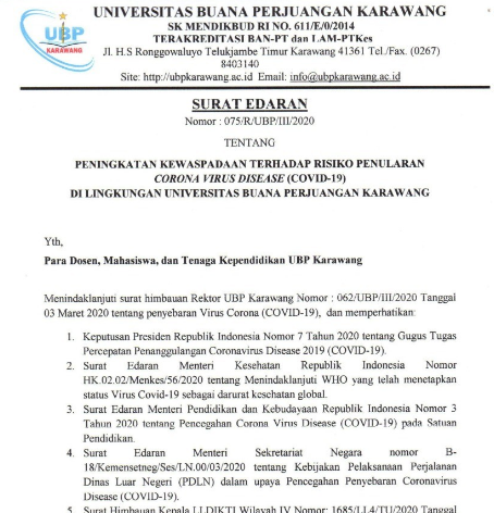 UBP Karawang Selenggarakan UTS Daring dengan media E-Learning Merujuk dari imbauan pemerintah mengenai upaya pencegahan dari penyebaran virus corona maka […]